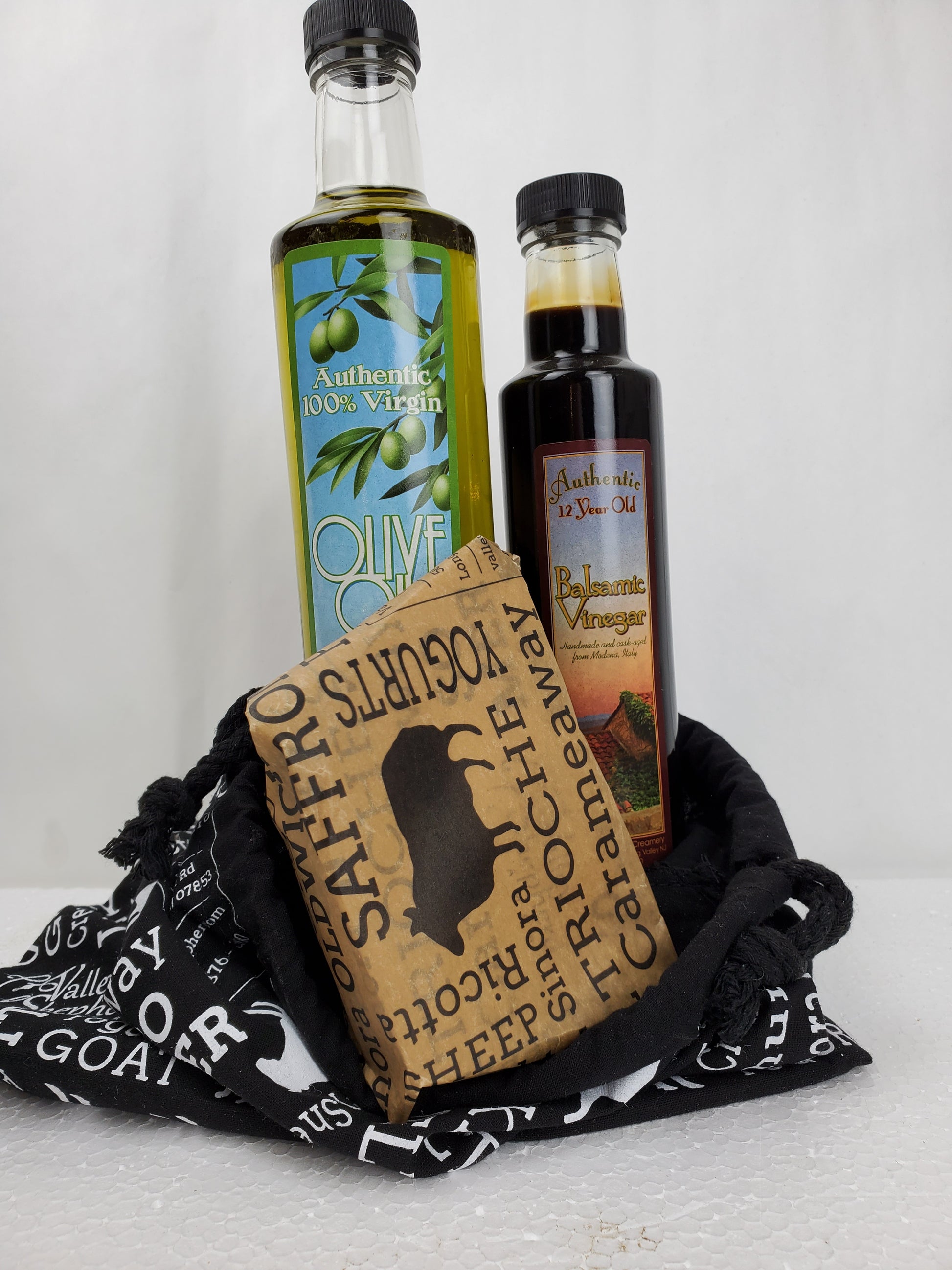 Its all here... 1/2 lb. of our Soprano, our nod to Pecorino Romano, a 250ml bottle of an amazing balsamic and a 500ml bottle of extra virgin olive oil. All in that custom black bag.